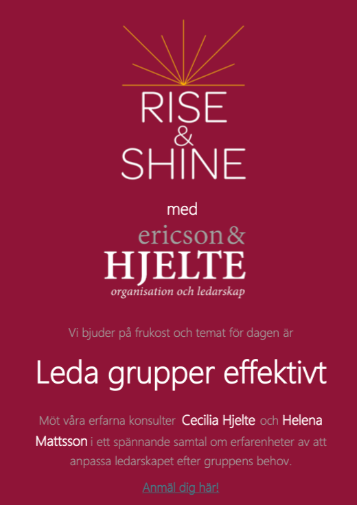 Rise & Shine är tillbaka för ännu ett år med skönt frukostmingel och intressanta samtal om organisation och ledarskap. Denna gång är temat “Leda grupper effektivt”.